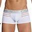 Deze Clever Ammolite Latin boxershort is wit en heeft een aantal transparante vlakken net onder de elastiekenband. De elastiekenband is zilverkleurig. Sexy witte boxershort.